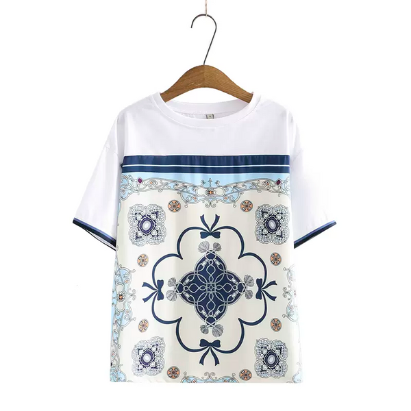 Plus Size Oriental Embossed Short Sleeve Blouse